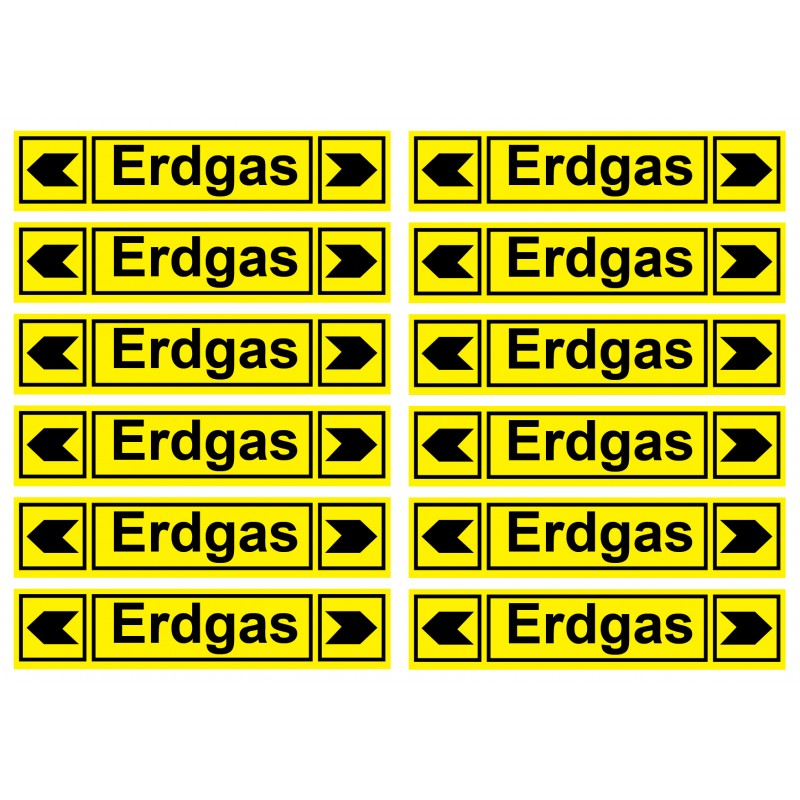 Rohrleitungsetikett Erdgas, Basisfarbe: gelb, Schriftfarbe: schwarz, Pfeilfarbe: schwarz, Material: selbstklebende, stark haftende Polyesterfolie mit Oberflächenschutz, rückseitiges Abdeckpapier, Format je Etikett: 140 x 30 mm Aufkleber Erdgas Bogen mit 12 Aufkleber Erdgas zur Verwendung auf Rohren.