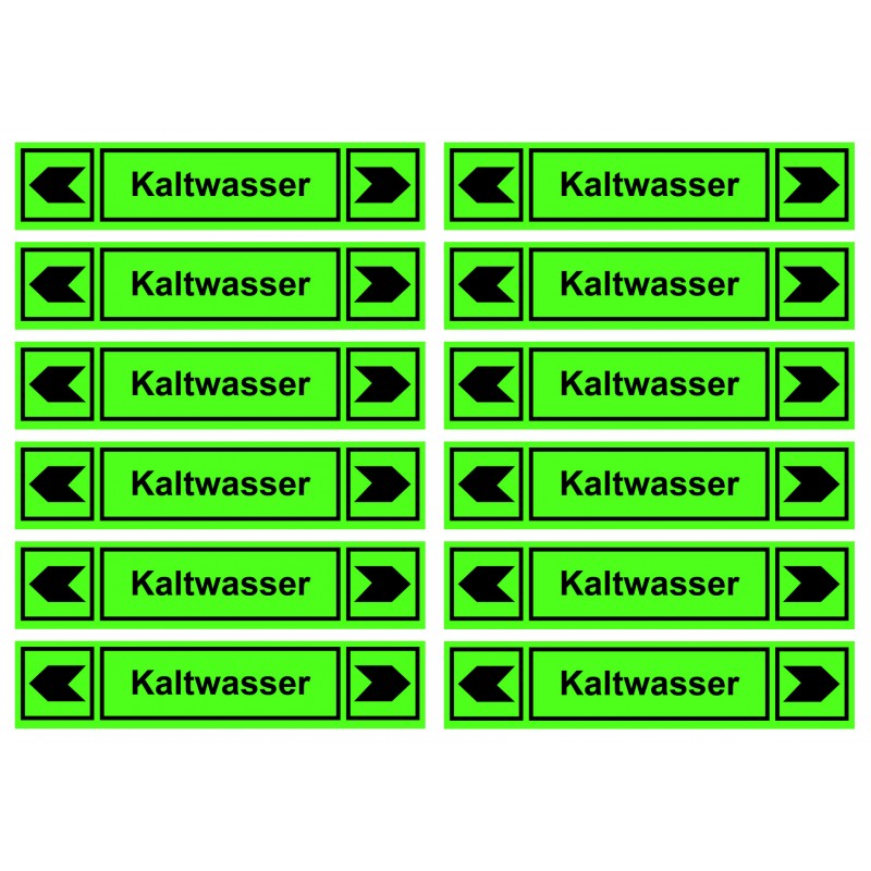 Rohrleitungsetikett Kaltwasser, Basisfarbe: blau, Schriftfarbe: schwarz, Pfeilfarbe: schwarz, Material: selbstklebende, stark haftende Polyesterfolie mit Oberflächenschutz, rückseitiges Abdeckpapier, Format je Etikett: 140 x 30 mm Aufkleber Kaltwasser Bogen mit 12 Aufkleber Erdgas zur Verwendung auf Rohren.
